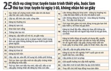25 DỊCH VỤ CÔNG THIẾT YẾU KHÔNG GIẢI QUYẾT HỒ SƠ GIẤY TỪ NGÀY 01/10