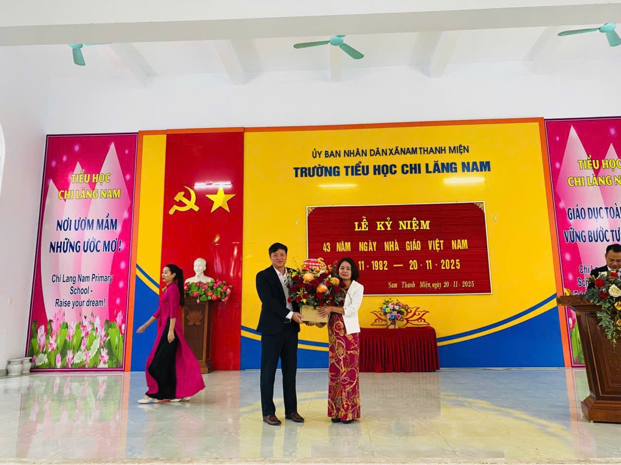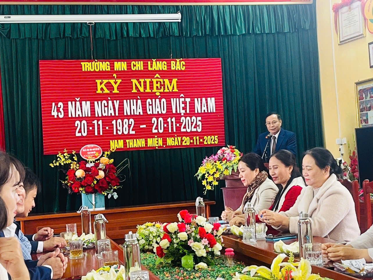 Nhân dịp kỷ niệm 43 năm ngày Nhà Giáo Việt Nam, các đồng chí lãnh đạo xã kính chúc các thầy giáo, cô giáo luôn mạnh khỏe, đoàn kết, luôn tự hào với nghề cao quý của mình, ý thức được trách nhiệm trong sự nghiệp “trồng người”, tâm huyết với nghề, tất cả vì học sinh thân yêu, nỗ lực nâng cao chất lượng giáo dục đại trà và mũi nhọn, góp phần nâng cao chất lượng giáo dục toàn diện của xã . Đặc biệt, mỗi thầy cô giáo là một tấm gương đạo đức, tự học và sáng tạo để học sinh học tập và noi theo; phấn đấu hoàn thành tốt nhiệm vụ năm học 2025 - 2026 như kế hoạch đã đề ra.